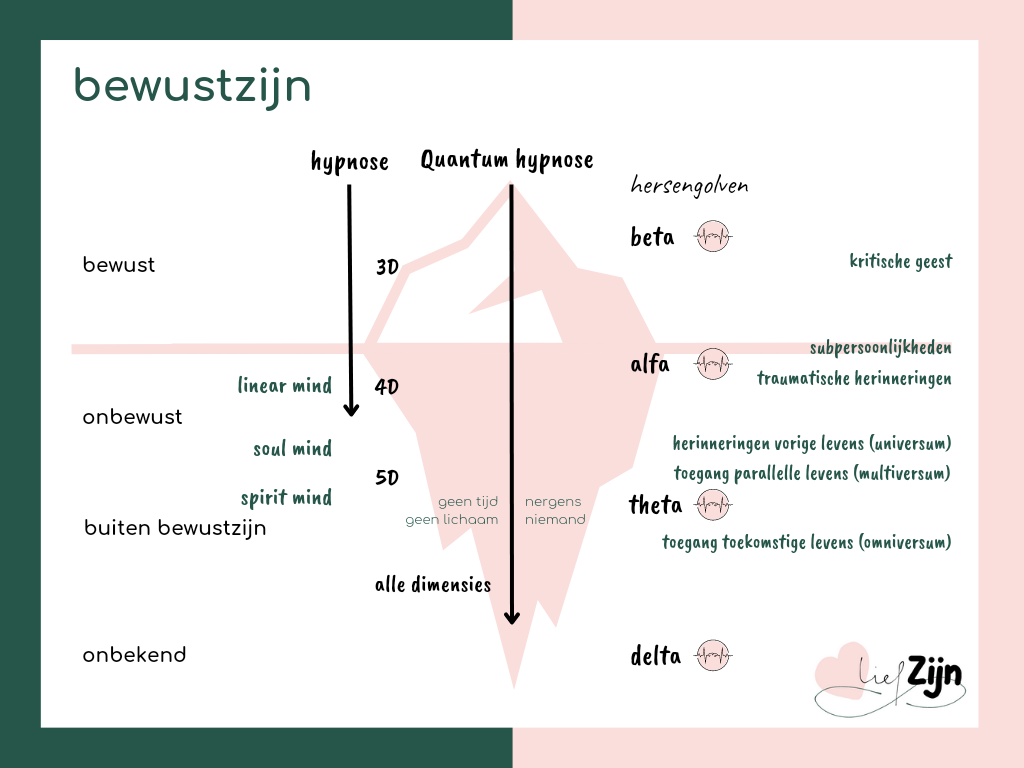 Met Quantum Hypnose kun je met de beste en krachtigste versie van jezelf in contact komen die alle uitdagingen in je leven al overwonnen heeft en jou kan helpen of kwaliteiten kan geven. Je gaat met een intentie in een diepe ontspanning, trance oftewel hypnose. Je Hogere Zelf of Quantum Zelf laat je scènes zien met een boodschap of kan via jouw stem praten en je vragen beantwoorden.